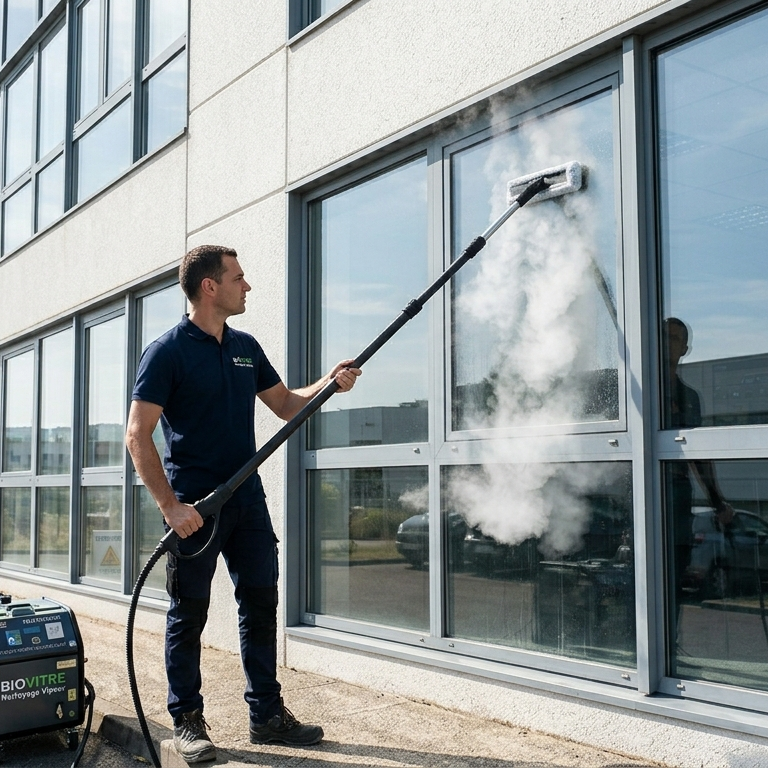 Biovitre, spécialiste du nettoyage de vitres depuis 18 ans, garantit un résultat sans trace grâce à une technologie vapeur unique à 200°C.